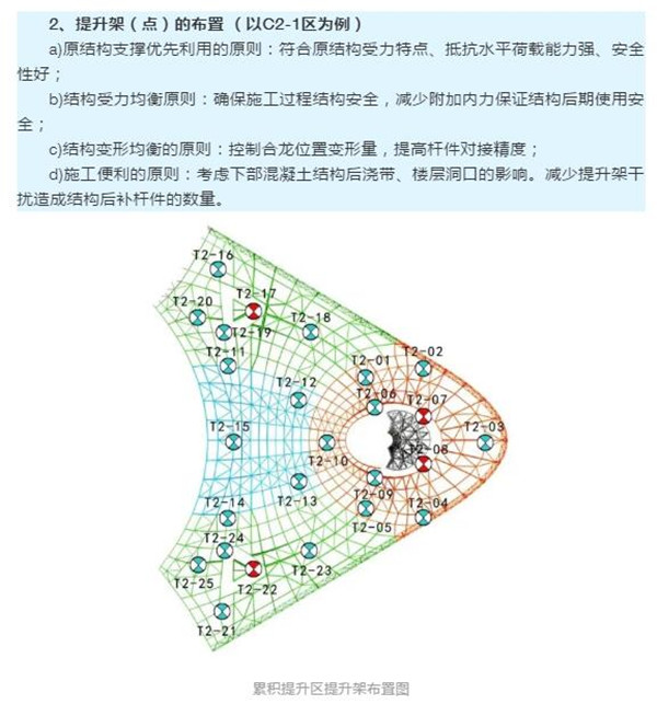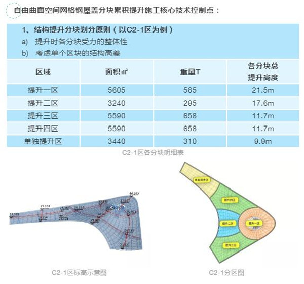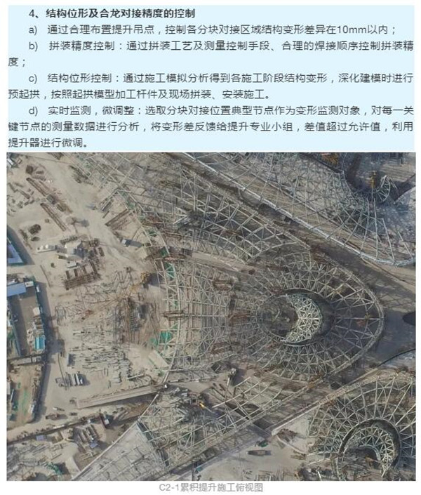 项目手艺团队通过对“整体先合龙后卸载”,“分区施工、保存各区周边支持、总体合龙后再卸载”,“分区装置、分区卸载、总体合龙”三种施工思绪的清静性、经济性、工期可行性的论证、较量,最后确定接纳“分区装置、分区卸载、变形协调、总体合龙”施工思绪。使用结构系统的特点,将18万平米的超大屋盖分为6大分区,每个分区自力施工、单独卸载,相互之间互不滋扰。凭证每个分区屋盖的结构特点、下部土建楼层漫衍情形、结构外部园地条件情形,通过对多种施工要领比照剖析,最终将屋盖分为39个施工小块,接纳在结构楼面原位装置、分块提升、累积提升、大型履带吊场外吊装多种施工工艺团结,通过施工模拟设计、精度控制手艺,实现了2千多米超长合龙线高精度对接和结构位形的精准控制,仅80天实现了屋盖结构封顶。施工质量、装置精度一次性通过验收,获得行业专家一致好评。
