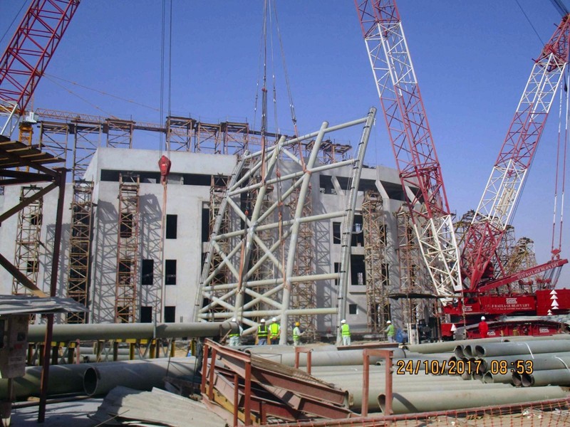 The KFU project is located in the city of hofuf in Saudi Arabia. The overall steel structure is divided into four parts: the shell, the frame, the link bridge and the stairs. The shell is a single-layer reticulated shell structure, which is divided into 31 Units and the heaviest unit is 54 tons.